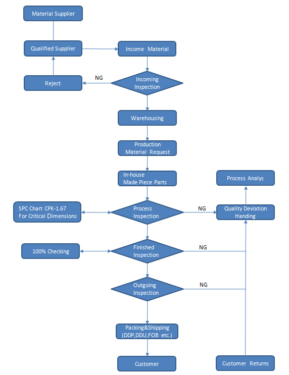 Our commitment to delivering precision parts begins with rigorous inspection and monitoring at every stage of production. Our skilled technicians use advanced measurement tools and cutting-edge technology to ensure that each component meets the highest standards of accuracy and consistency. We adhere to tight tolerances and employ thorough quality checks, including dimensional inspections and surface finish assessments. Our excellent QA team guarantees material quality, processing control, and outgoing quality control to meet customers’ requirements perfectly. Specializing in low and medium volume production of industrial machined parts, including customized precision parts and prototypes, we produce high-quality components that precisely match your needs. Quality policy :